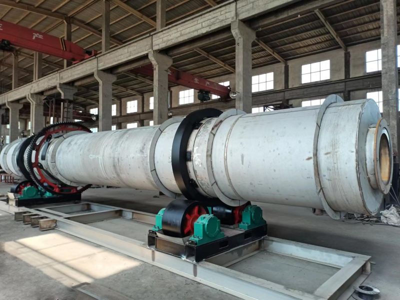 冷卻機主要由一個與水平成3-5%斜度的回轉筒體構成。內裝有揚料板。筒體兩端借助于托圈支撐在擋、托輪裝置上,低端托圈和擋輪滾動接觸,以阻止其筒體軸向下滑動。筒體的回轉是借助于固定在筒體上的大齒圈,通過一套傳動裝置帶動。物料在揚料區被多次揚起,并均勻地拋撒,冷卻空氣與熱料進行強烈的熱交換。特別是在低溫區,可以通過改善揚料板結構、布置形式以及調整筒體的斜度和轉速,來增加熟料與冷卻空氣的接觸時間,控制熟料的移動速度,使熟料內部的熱量有充足的時間向表面傳導,從而對溫度較低物料的熱量充分回收。